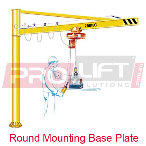 This over-braced, free standing slewing jib crane has been designed fully in accordance with Australian Standards AS 1418 for lifting loads up to 250kg. The crane jib incorporates an over-brace design for a cost effective entry-level slewing jib crane, simple to operate taking up minimal floor space area using a round base plate for mounting onto new concrete footings or steel structures.