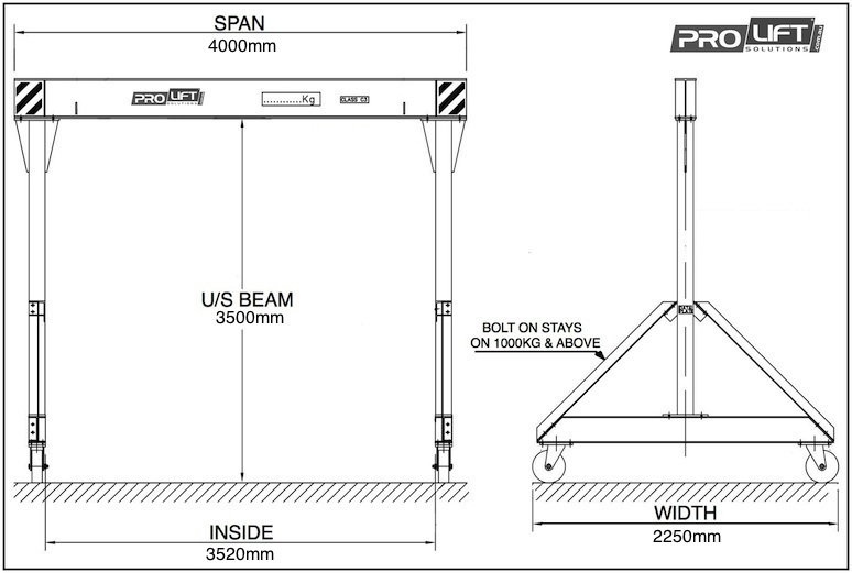 The standard crane height is 3.5m from ground level to the underside of the cranes lifting beam. This height can be reduced on request. Should you require a specific crane height not listed please contact Prolift.