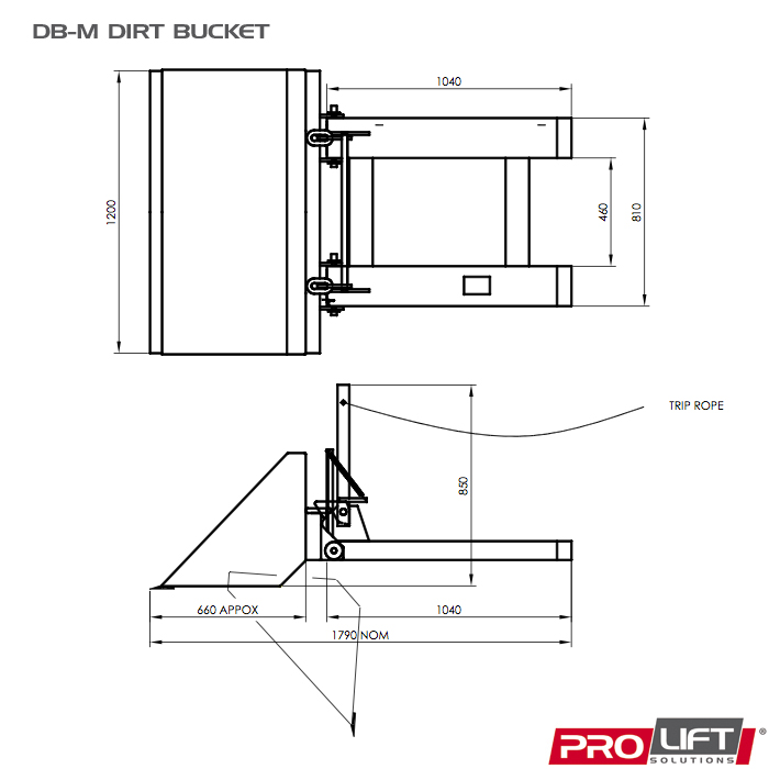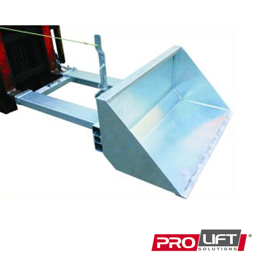The type DB-M-G Dirt Bucket is a slip-on attachment allowing quick connection to a Forklift. This Dirt Bucket is especially useful for removing loose material from floors such as gravel, grain or coal. This bucket has been manufactured with a hardened steel wear edge. The dumping action is via a simple mechanical lever, operated by the driver without leaving the their seat.