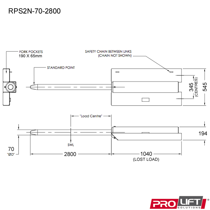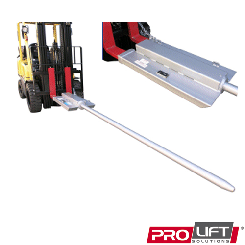 Slip-on Roll Prong suitable for fabric, cable and coil products. Can also be used for carpet handling, but usage is generally restricted to larger forklifts due to the extended load centre created by the length of the tines. These attachments quickly adapt to almost any forklift and require only the connection of a safety chain to prevent unintentional disengagement. Prongs are manufactured from high tensile steel and can be made to any length.
