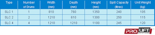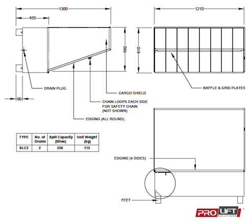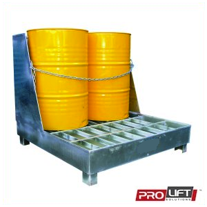 The type SLC2 Cargo Shield Spill Bin offers a complete protection against damaging and costly chemical spills. This unit caters for up to 2 standard 205 litre steel drums and has a Cargo Shield with a safety chain across the front for added protection. Close spacing support bars allow for large or small drums up to 2000kg SWL to be placed directly onto the Spill Bin. The baffled containment area allows the Spill Bin to be safely moved when full, minimising spillage. To empty the containment area, a single Drain Plug has been provided at the side of the Spill Bin. All type SL Spill Bins come in a hot-dipped Galvanised finish.